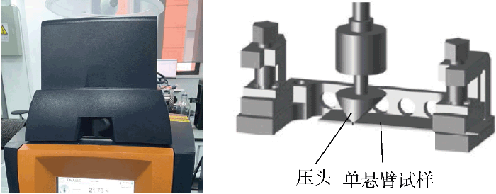 在振幅扫描实验条件下,室温( 20 ℃),采用单悬臂梁法,频率1 Hz、且应变幅值范围1×10-4~1×10-3,对尺寸为17.5 mm×7.9 mm×0.7 mm的材料进行阻尼性能测试.测试使用TA-Q850动态力学分析仪(dynamic mechanical analysis, DMA),如图2所示.通过测量损耗因子tan δ来表征材料的阻尼性能,其中δ为应力与应变的相位差角.