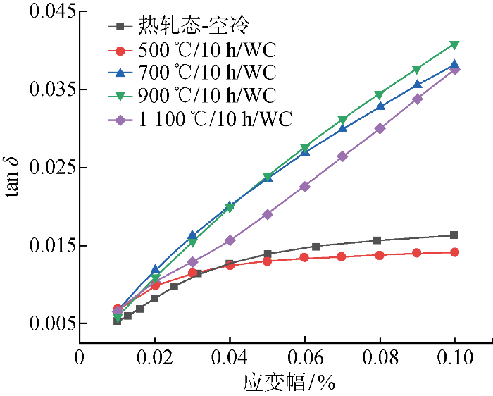图3为Fe-Mn合金在500、700、900、1 100 ℃不同热处理温度下的阻尼性能的变化曲线.图4为1×10-3应变幅下损耗因子与热处理温度的关系.从图中可看出,当合金处于热轧态(as-hot-rolled)时,1×10-3应变幅下的损耗因子tan δ为0.016.这一现象归因于热轧变形在900 ℃以上,而Fe-Mn的奥氏体化温度低于900 ℃(As奥氏体转变开始点约为200 ℃,Af奥氏体转变结束点约为245 ℃),其在变形过程中发生完全奥氏体化,产生大量位错.冷却后,奥氏体化产生了不全位错的产生和滑移,降低了合金的阻尼性能.经500 ℃热处理后,1×10-3应变幅下的 tan δ 为0.014.相较于热轧试样略有下降,这可能是由于热处理温度较低,奥氏体化后组织未发生明显回复.在700~1 100 ℃温度范围内,合金的损耗因子随应变幅近似线性增加,随热处理温度的升高而呈现先升高后降低的趋势,在900 ℃时达到最大0.041.与900 ℃热处理试样相比,1 100 ℃试样的损耗因子有所降低,这可能是由于ε马氏体板条尺寸的增加,板条内的层错密度和ε马氏体/γ奥氏体界面长度相对减少,从而降低了损耗因子.