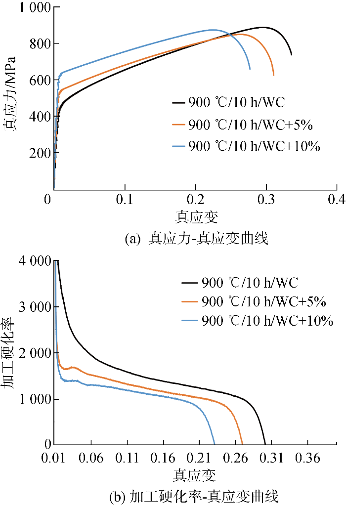 图8为Fe-Mn合金预变形后的应力-应变曲线.图8(a)为真应力-真应变曲线.结果表明,热处理后未经过预变形的试样具有较高的断后伸长率和较低的屈服强度.随着预变形量的增加,合金的断后伸长率逐渐降低,而屈服强度则逐渐增加.预变形使得合金的屈服强度显著增加,相较未预变形试样,5%预变形试样的屈服强度增加114 MPa,10%预变形试样的增加量高达208 MPa.相比之下,预变形对于Fe-Mn合金的抗拉强度的影响较小,5%预变形试样抗拉强度减少4 MPa,10%预变形试样抗拉强度增加42 MPa,均大幅小于屈服强度增加量.同时,预变形使断后伸长率有所降低,5%预变形试样的断后伸长率减少3.5%,10%预变形试样减少了8%.图8(b)为加工硬化率-真应变曲线.结果显示,热处理后未预变形试样具有较高的加工硬化率,然而,随预变形量的增加,合金的加工硬化率逐渐降低.
